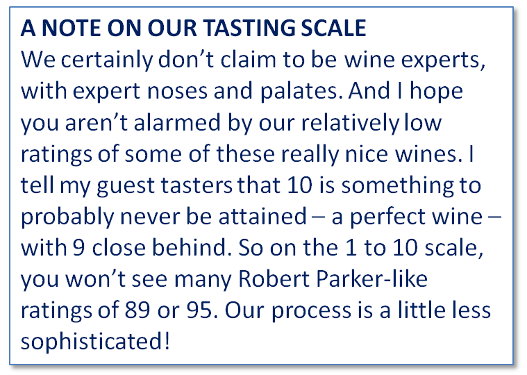Overall, our ratings ranged from 6 to 8 (on a scale of 1 to 10), averaging right at 7. This was still very good, but a long way from the “perfect” wine that would rate a 10 (I’m not convinced it exists).